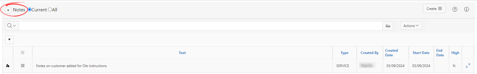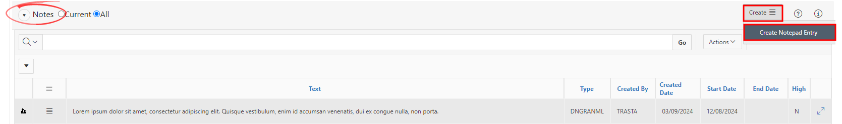From the Notes region, select the Row Action Icon for the relevant note, and select Update Notepad Entry.