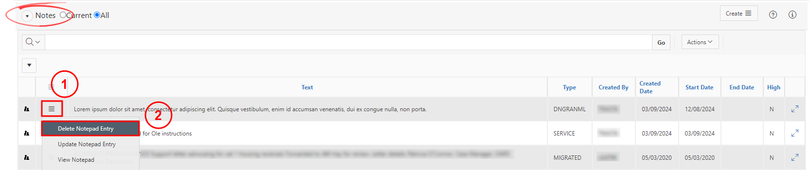 From the Notes region, select the Row Action Icon for the relevant note and select Delete Notepad Entry.
